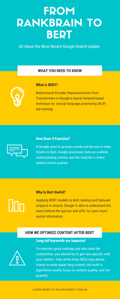 When Google introduced RankBrain in 2015, it had the same purpose as Bert: to improve users’ search intent and deliver more valuable results. RankBrain analyses users’ queries to understand the relationship between words and context. The Bert update complements the RankBrain algorithm but doesn’t replace it entirely. Google may decide how to interpret a specific query and apply one technique or the other, or sometimes even a combination of the two.